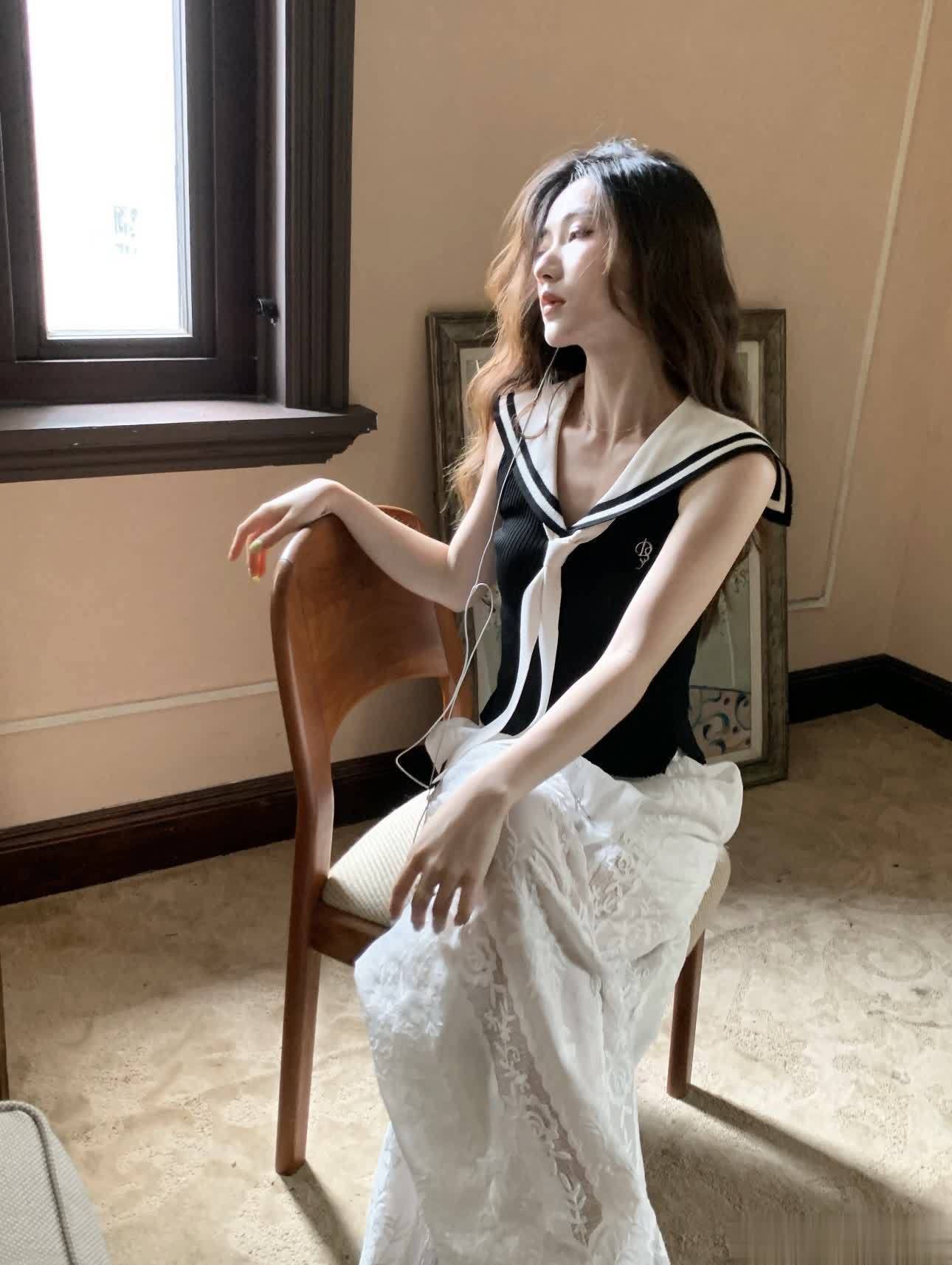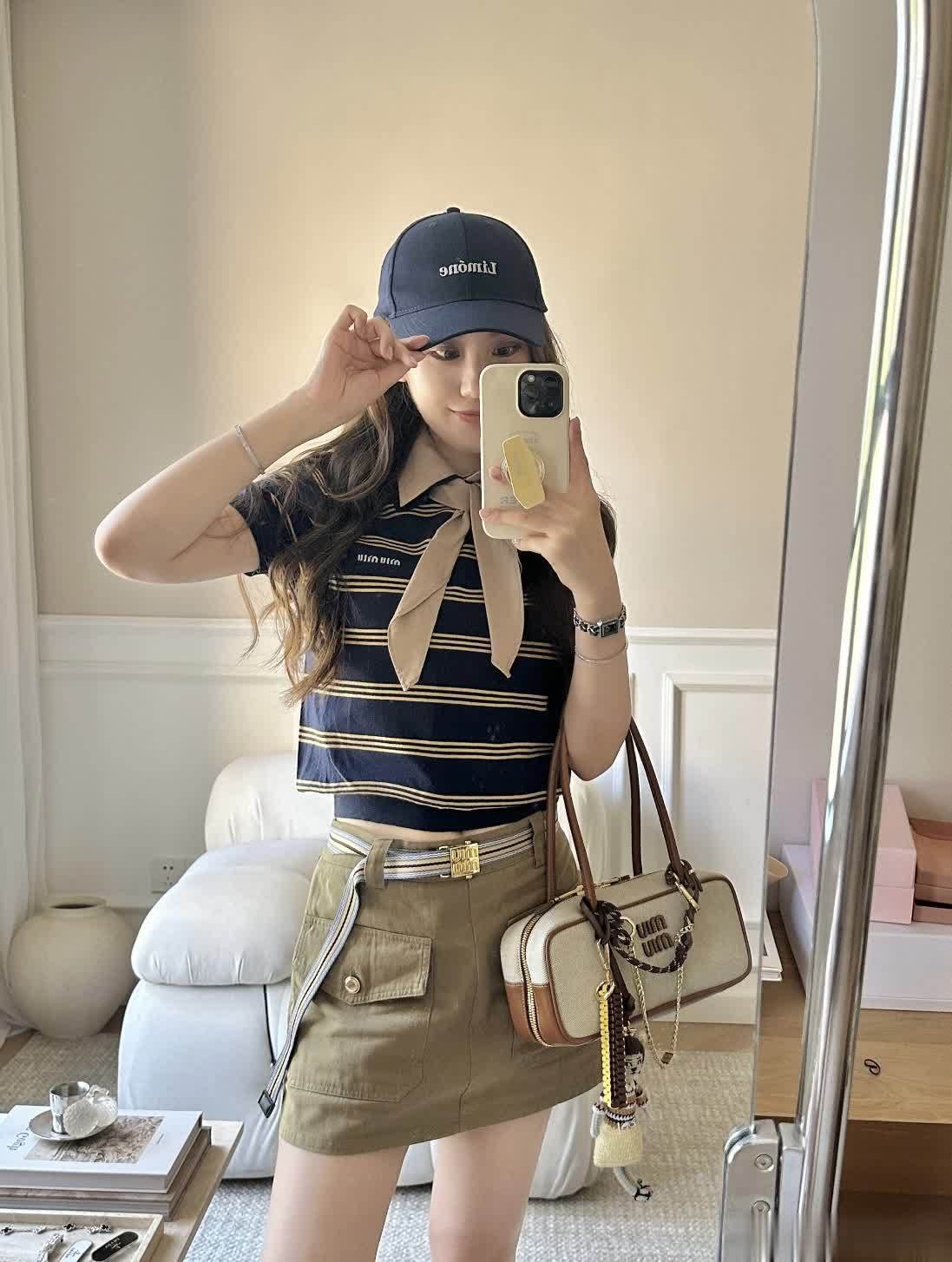 近期非常火热的miu系穿搭其实也是学院风的一个衍生系,同样采用条纹、领带等配饰去装点,在颜色的选择上往往都是偏高级,藏蓝、卡其、米白等都是经典搭配色系。