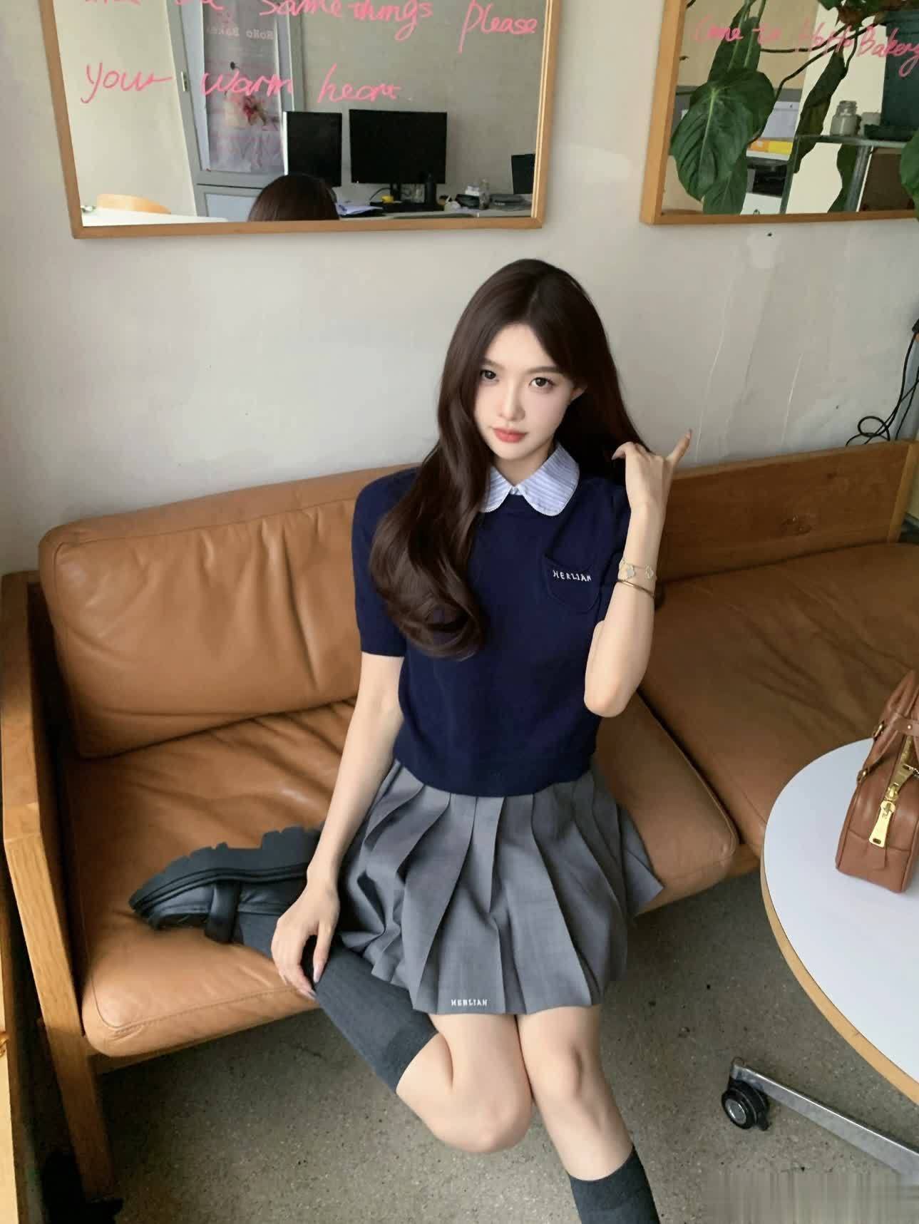 更深层次的穿搭可以叠穿,衬衫+针织背心/针织上衣+百褶短裙直接拿捏学院风,也是符合学院风的“刻板”印象,中筒袜和小皮鞋是经典搭配。