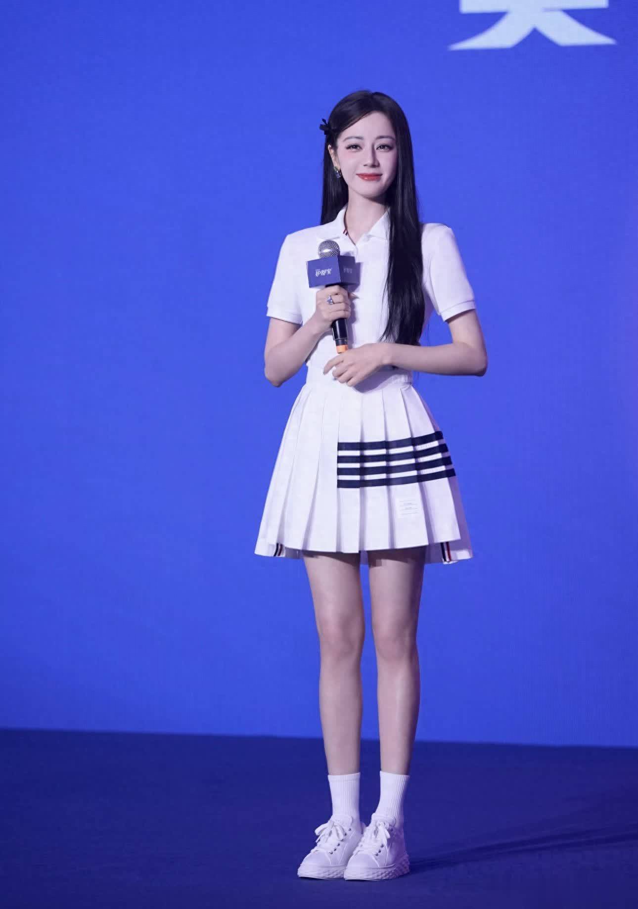 热巴身穿TB服装惊艳亮相活动,白色polo衫+白色百褶短裙,经典的黑条纹设计满满的TB风,配上小白鞋和小白袜,一整个学院风青春感。